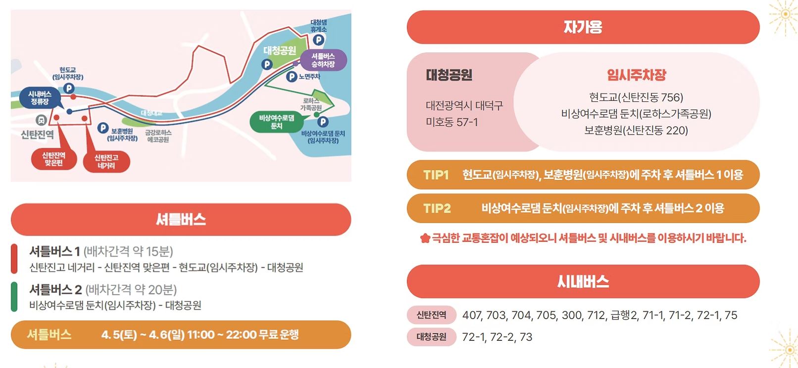 - 임시주차장: 현도교 하상(신탄진동 756), 비상여수로댐둔치(대청호로하스캠핑장), 석봉초(신탄진남로 20), 대전보훈병원(신탄진동 2-4)