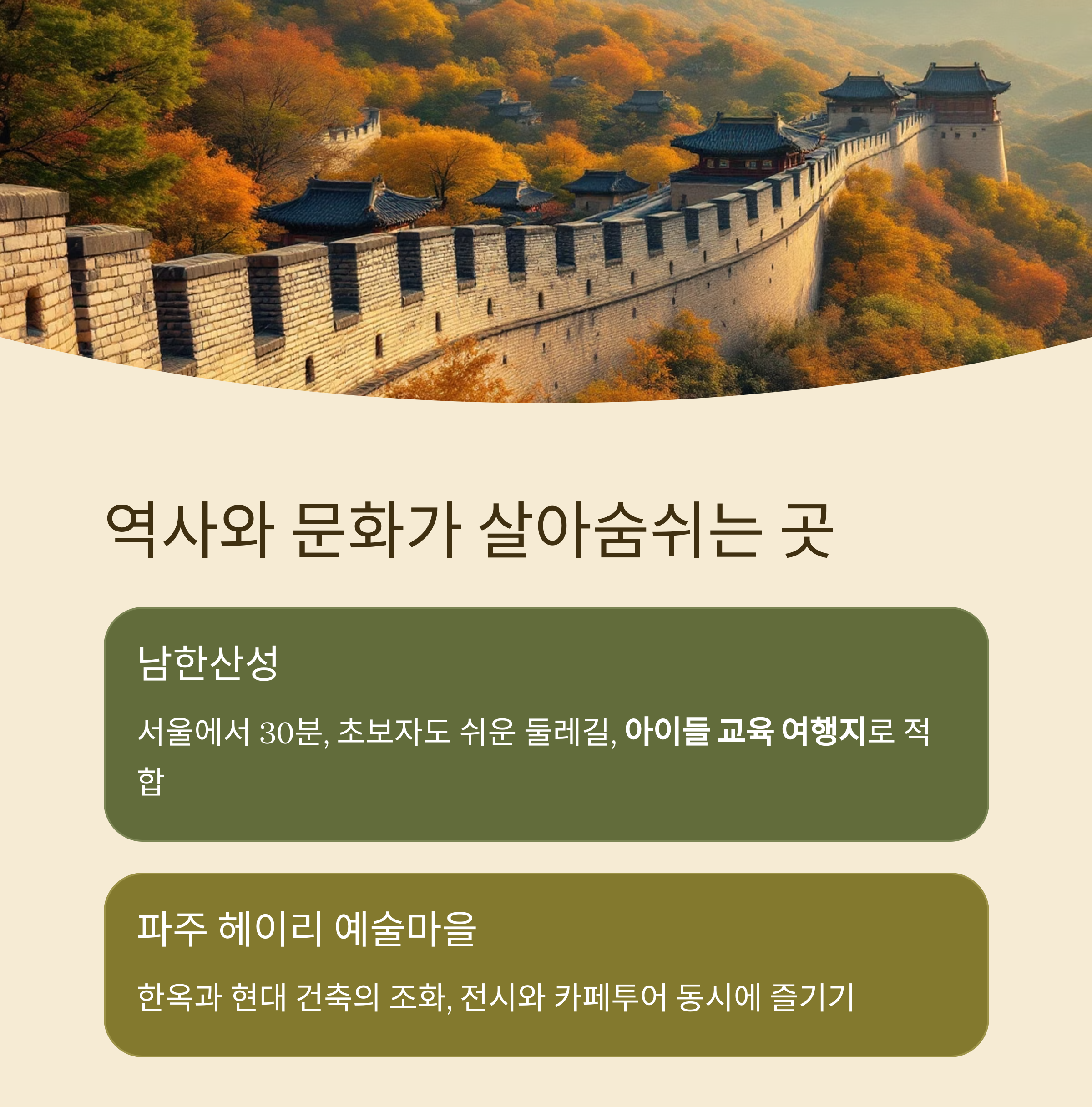 | 파주 | 헤이리 예술마을 | 왕복 1.5시간 | 전시, 카페, 문화 투어 |