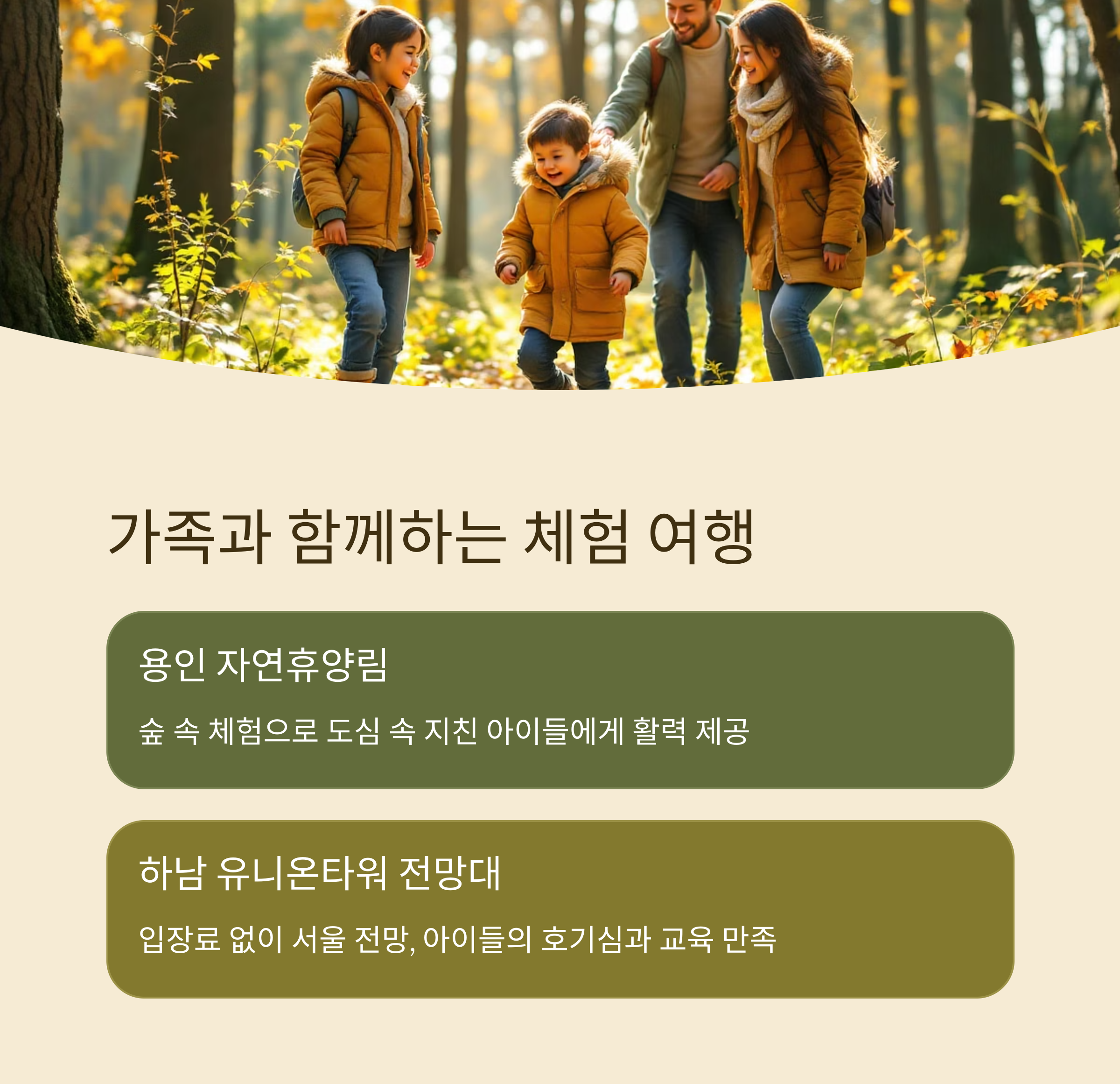 | 용인 | 자연휴양림 | 왕복 1.5시간 | 가족 체험 여행지 |