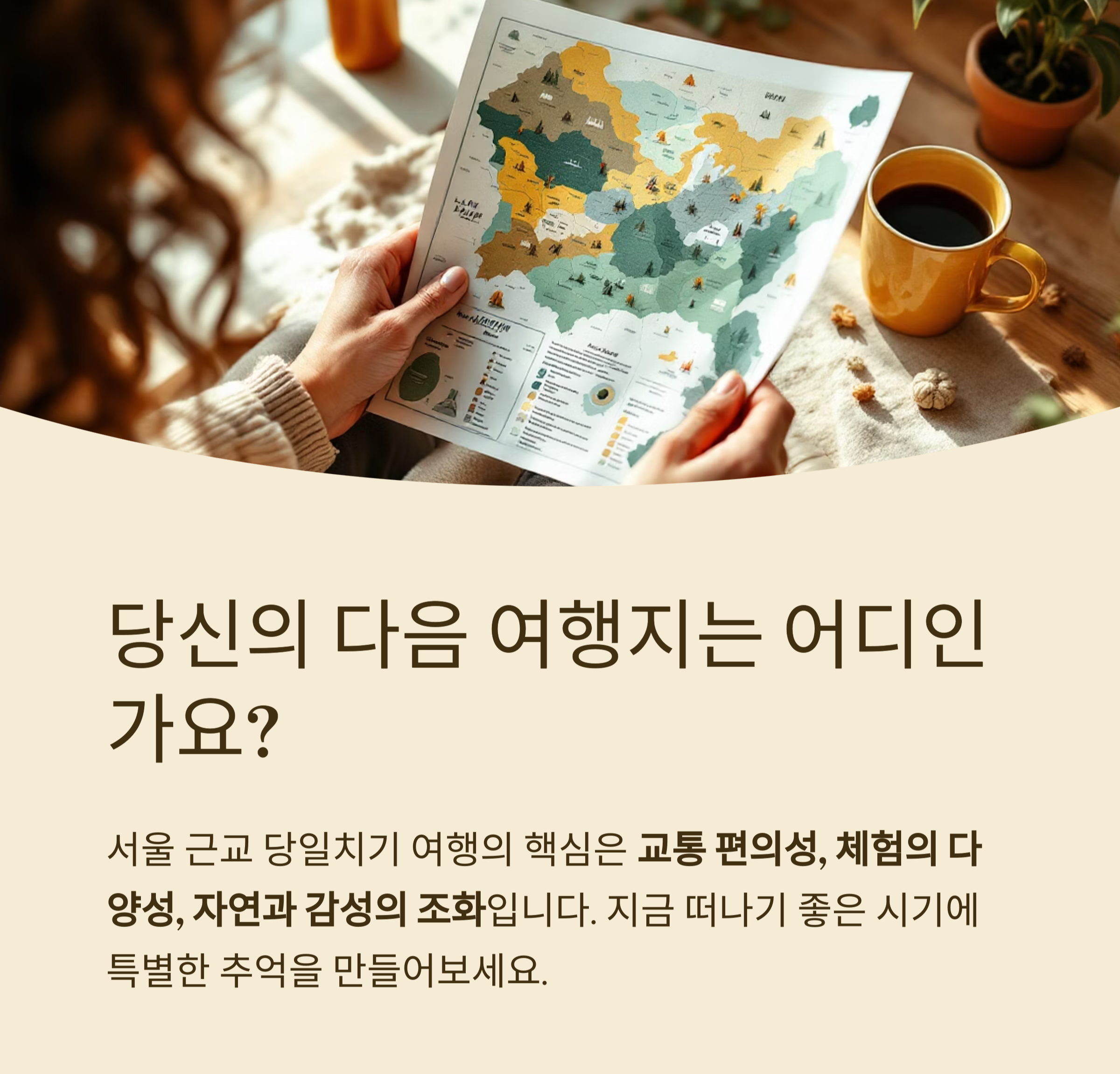 핵심은 교통 편의성, 체험의 다양성, 그리고 자연 또는 감성 요소의 조화입니다.