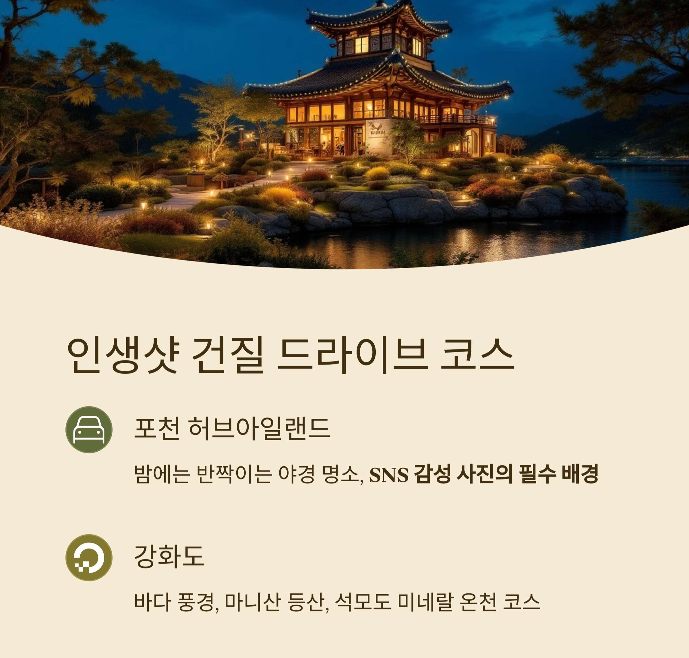| 강화도 | 마니산, 석모도 온천 | 왕복 2시간 | 등산+온천 코스 조합 |
