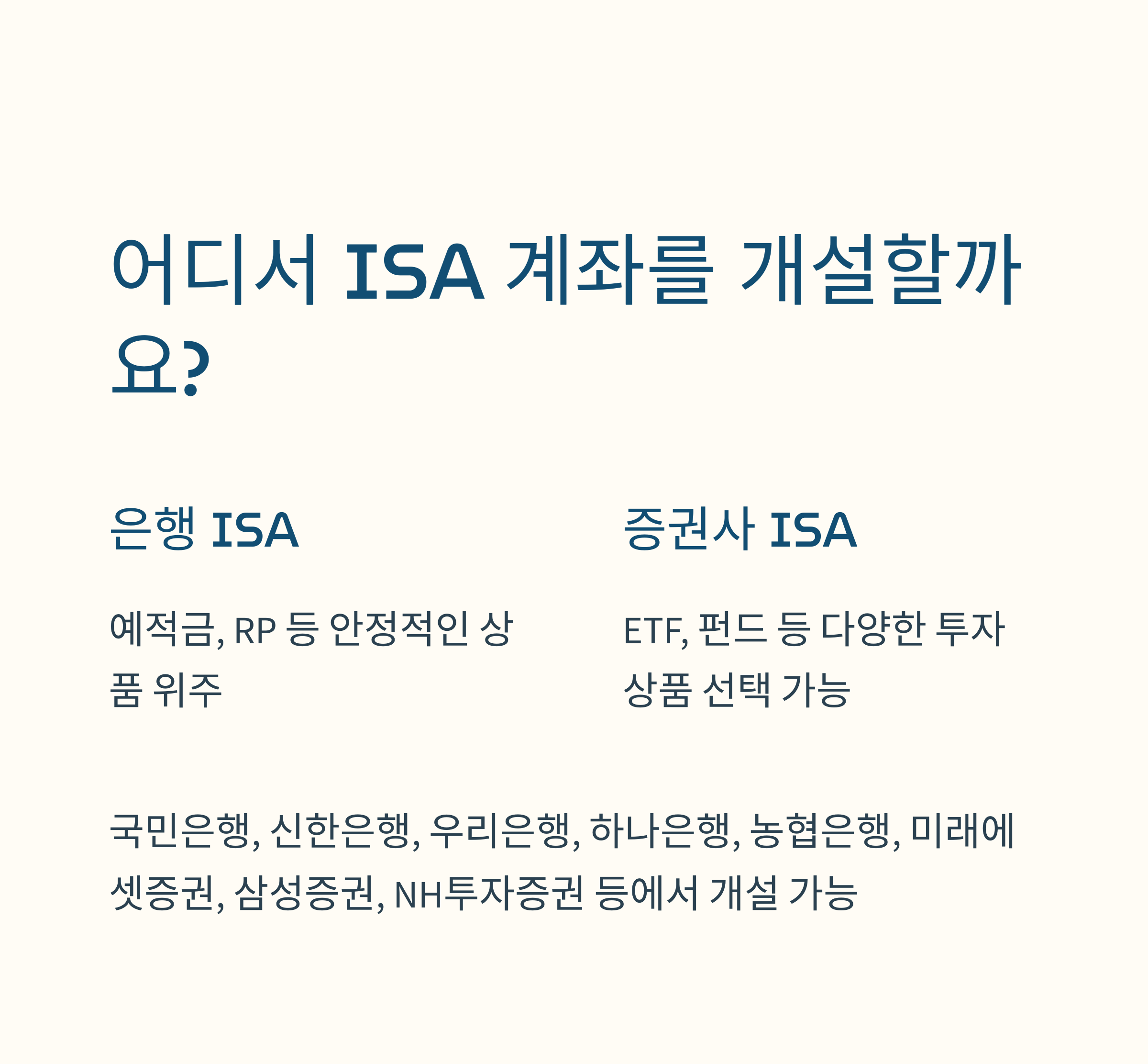 - 은행 ISA: 안정적인 상품 위주 (예적금, RP 등)